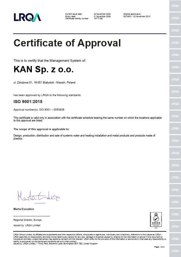 KAN , u težnji za punim zadovoljstvom korisnika te brigom za razvoj i modernizaciju System KAN-therm, održava najvišu kvalitetu isporučenog proizvoda i visok standard usluge. Potvrda tome je dokumentiran, implementiran i u potpunosti proveden Sustav upravljanja kvalitetom temeljen na normi ISO 9001:2015, čija je učinkovitost podložna stalnom unapređenju. Sustav je certificiralo renomirano certifikacijsko tijelo Lloyd's Register Quality Assurance Limited.
